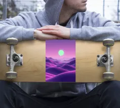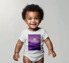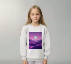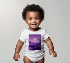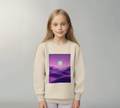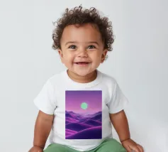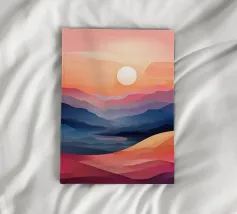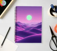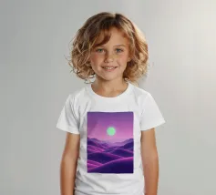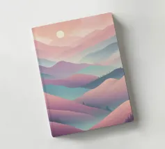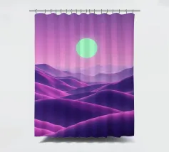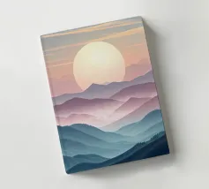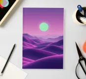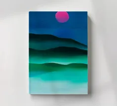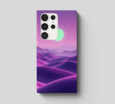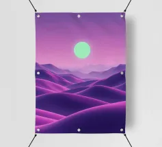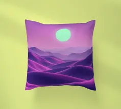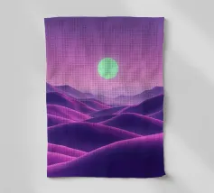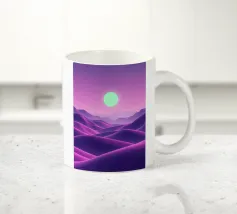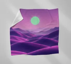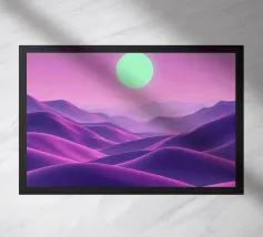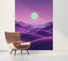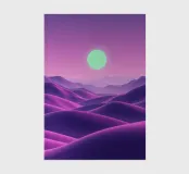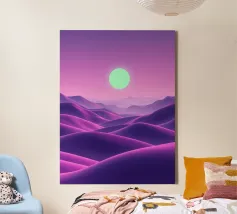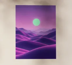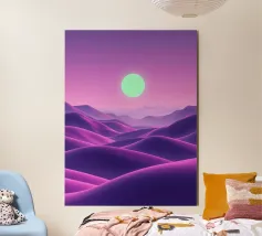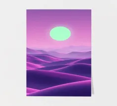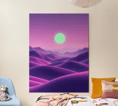This captivating digital artwork, "Astral Serenity," transports you to a dreamlike alien landscape bathed in a vibrant gradient of purple and pink. Soft, rolling dunes, rendered in rich magenta and deep violet hues, create a hypnotic rhythm across the foreground. Dominating the sky is a brilliant, mint-green sun, a luminous orb that casts a serene, otherworldly glow. The distant mountains fade into a hazy, atmospheric perspective, adding depth and a sense of infinite tranquility. This piece is a perfect blend of bold color and peaceful composition, ideal for adding a touch of modern, cosmic w