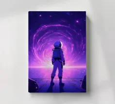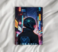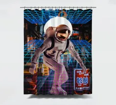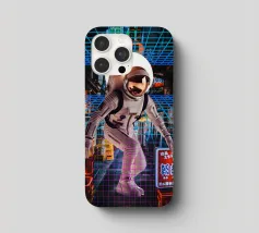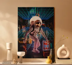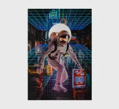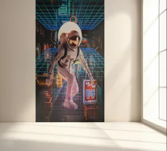 The image features an astronaut in a white spacesuit, seemingly walking through a neon-lit Tokyo street. The astronaut's helmet reflects the surrounding lights. A bright, circular light source is positioned behind the astronaut. A blue and pink retro grid overlay adds a futuristic, cyberpunk aesthetic to the scene.