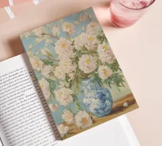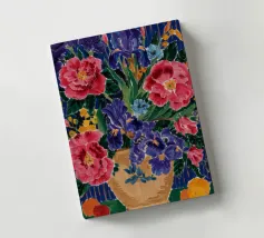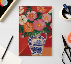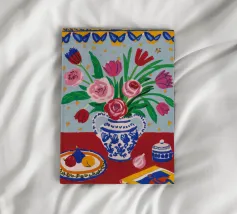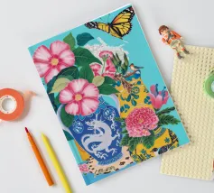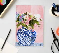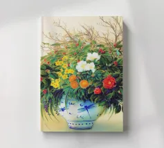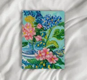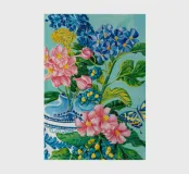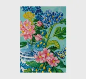 A vibrant still life featuring a blue and white patterned vase overflowing with blue hydrangeas and other flowers, with butterflies, against a bright turquoise background.