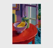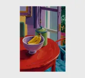 Bananas in a bowl atop a vivid red table near a sunlit window create a cheerful composition of color and balance.