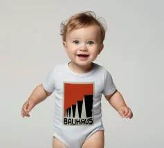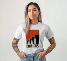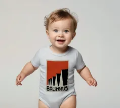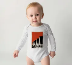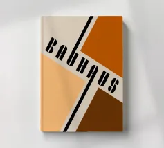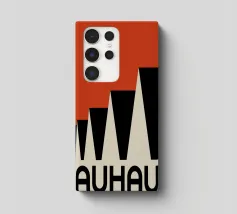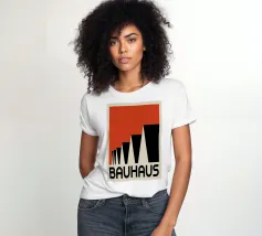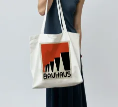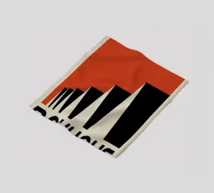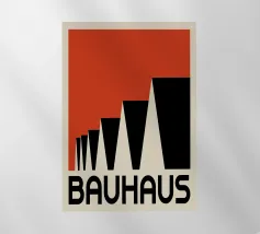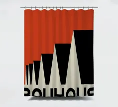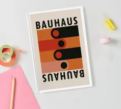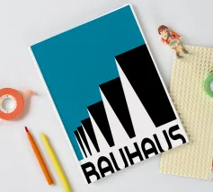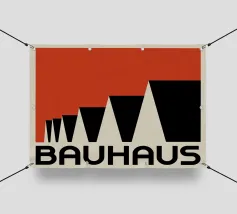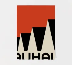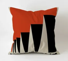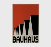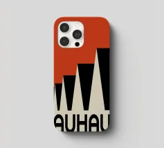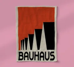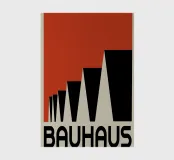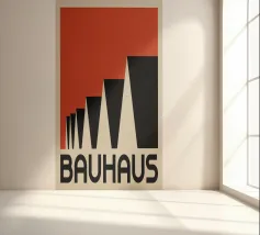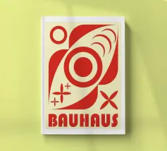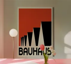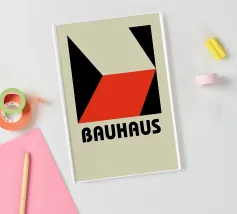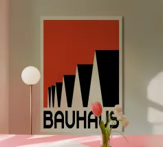 Bold Bauhaus abstract geometric art print featuring triangular shapes resembling architecture or a cityscape, set against a striking red and cream background. Minimalist design with strong contrast embodies the iconic Bauhaus aesthetic. High-quality digital art file (7000x5000px, 300 dpi) perfect for stunning prints. Ideal modern wall art.