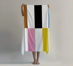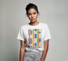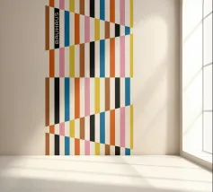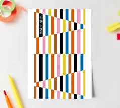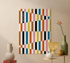 Explore vibrant geometric abstraction with this striking Bauhaus graphic art print. Featuring a captivating composition of geometric bars and rectangles in bold colors (orange, brown, pink, white, blue, black, yellow), arranged in a dynamic interlocking pattern with diagonal elements. On the left, 'BAUHAUS' is written vertically in a stylized font. This artwork embodies the principles of modernist design – form, color, and composition, with a contemporary feel influenced by the Bauhaus movement. This high-quality digital art file boasts a stunning 7000x5000 pixel resolution at 300 dpi, ensurin