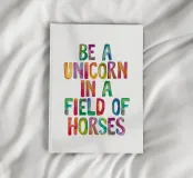 Elevate your space with this enchanting typography art print featuring the empowering phrase "Be a Unicorn in a Field of Horses" in vibrant rainbow watercolour lettering. Hand-painted with meticulous detail, this eye-catching design pops against a crisp white background. Perfect for adding a splash of colour and positivity to any room, this unique artwork serves as a daily reminder to embrace your individuality and stand out from the crowd. Ideal for home offices, bedrooms, or living spaces, this print is sure to inspire and delight both adults and children alike.