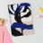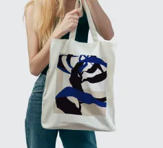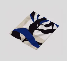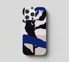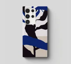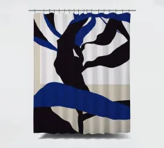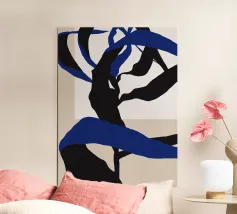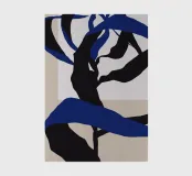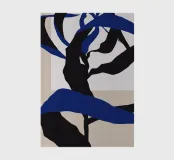 Abstract shapes in blue and black intertwine with each other, creating a striking contrast against a beige and white background. The composition appears dynamic and fluid, evoking a sense of movement and depth.