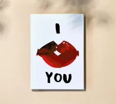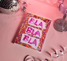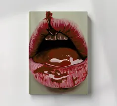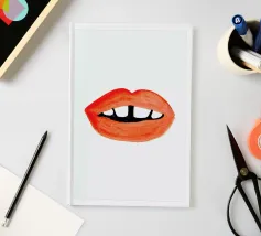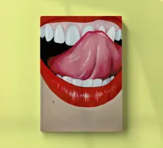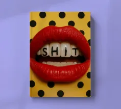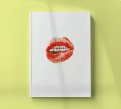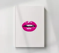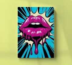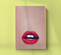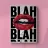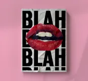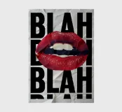 "A pair of glossy, vibrant red lips positioned between the words 'BLAH' stacked vertically in bold, black typography against a clean white background, creating a playful and dismissive statement. The contrast between the realistic lips and the graphic text adds a pop art feel.",
