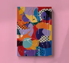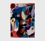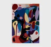 This painting is a bold and colorful abstract composition with a mix of organic and geometric shapes. The use of bright colors and dynamic forms creates a sense of movement and energy.