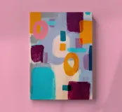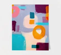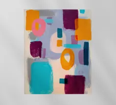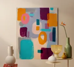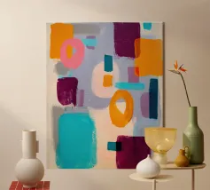 A vibrant abstract painting composed of bold color blocks, rounded shapes, and expressive brushstrokes in turquoise, magenta, mustard, pink, and soft lilac tones. The textured surface gives the piece a lively, handcrafted energy, while the balanced composition keeps it modern and stylish. Perfect for brightening contemporary interiors with color, movement, and personality.