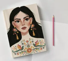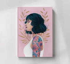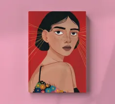 This painting depicts a person with a tattoo of a rose on their shoulder. The person is wearing large, golden earrings, and the background is a striking red, emphasizing the bold and expressive nature of the artwork.