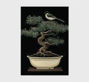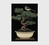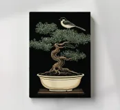A delicate bird sits on a branch of a bonsai tree in a light-coloured bowl. The delicate structure of the tree and the detailed needles contrast with the dark background. The motif radiates tranquillity, simplicity and a deep connection to nature.