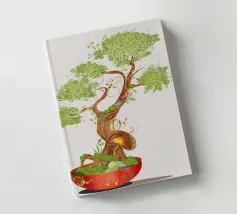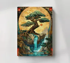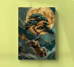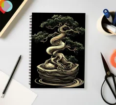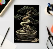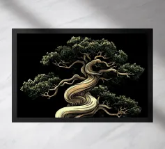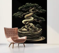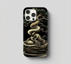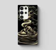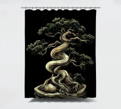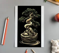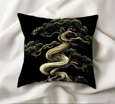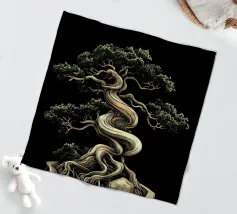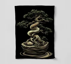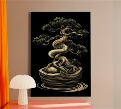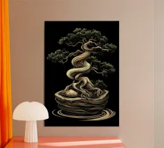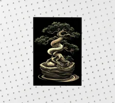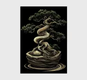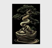 A bonsai tree with an extremely twisted, almost sculptural trunk stands in a bowl with a water wave pattern. The dense foliage in dark green forms a powerful contrast to the light-coloured wood of the trunk. The black background colour enhances the drama of this elegant depiction of a bonsai masterpiece.