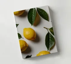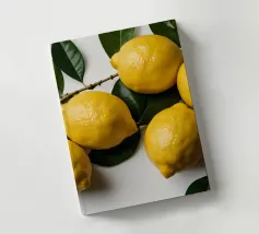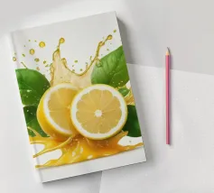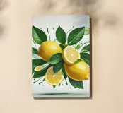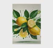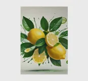 Fresh lemon halves are bursting with juice, creating a dynamic splash against a light backdrop, enhanced by vivid green leaves that add a pop of color.