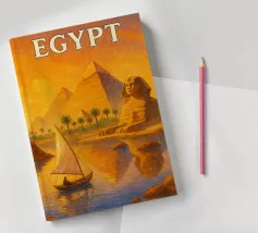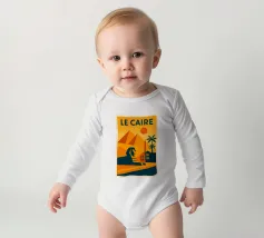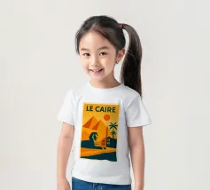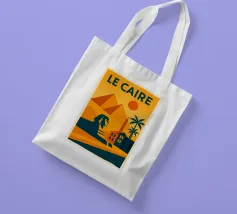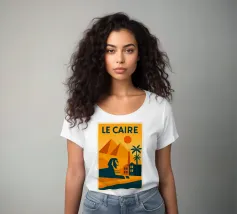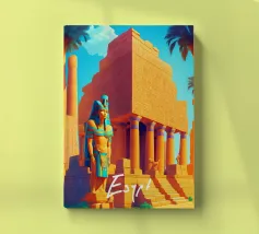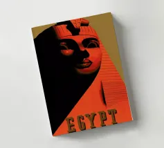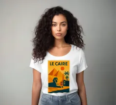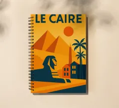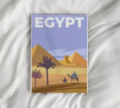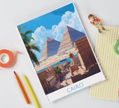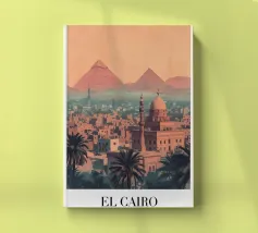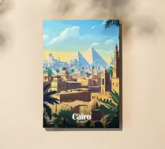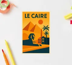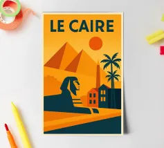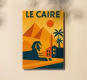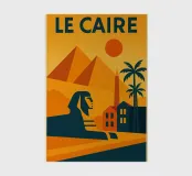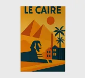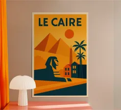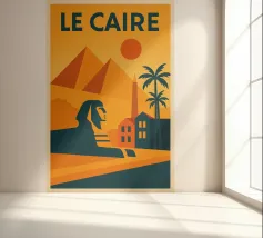 This vintage poster illustrates Cairo with its majestic pyramids, the sphinx and palm trees at sunset. A poster in warm colours that captures the magic of ancient Egypt and the exotic Orient. Perfect for a travel and historical wall decoration.