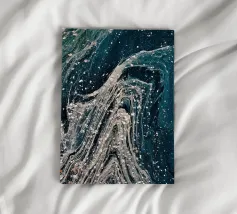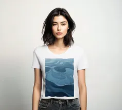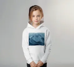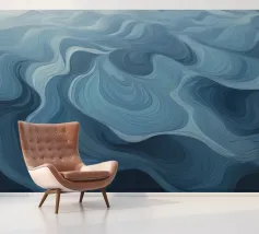 An expansive view of undulating blue waves showcases intricate patterns formed by water. The soft light highlights the serene beauty of the ocean, creating a sense of calm.