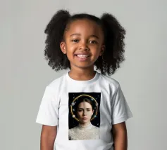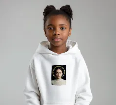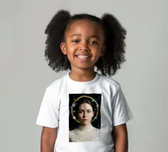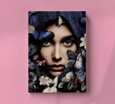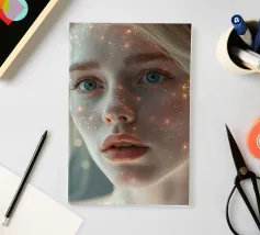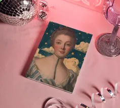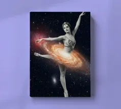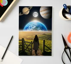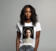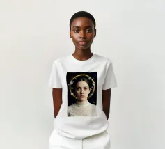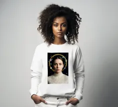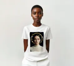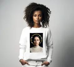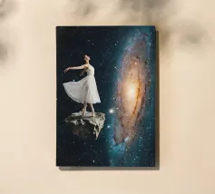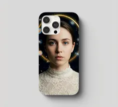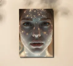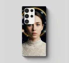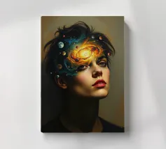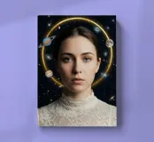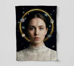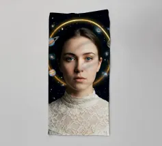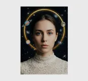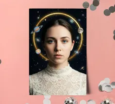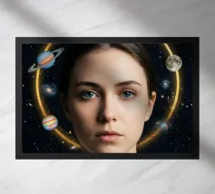 This striking surreal portrait blends human beauty with cosmic wonder. A woman stands against a star-filled universe, framed by a glowing golden halo decorated with planets, moons, and distant galaxies. Her vivid blue eyes and vintage lace attire add elegance, while the celestial elements create a sense of mystery, enlightenment, and imagination. Perfect for lovers of fantasy art, astrology, space themes, and symbolic visuals that explore inner worlds and the vastness of the cosmos.