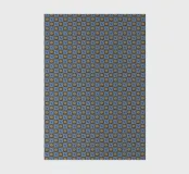 A repetitive pattern featuring squares with a geometric design fills the space, each containing a central motif with sweeping, curved lines. The color palette is primarily blue and brown, creating a visually rhythmic and consistent arrangement.