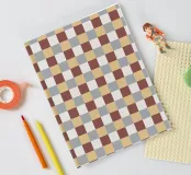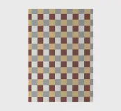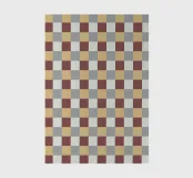 A pattern of alternating colored squares creates a checkerboard effect with shades of beige, gray, and brown. The grid-like design is symmetrical and evenly spaced.