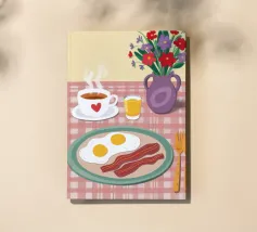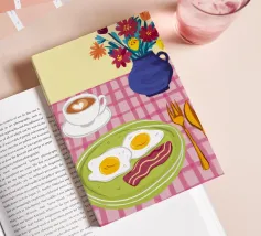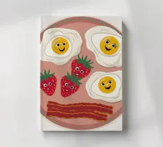 A vibrant top down illustration of fried eggs and bacon on a pink and white checkered background. The style is graphic, modern, and has a pop art feel.