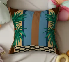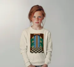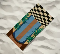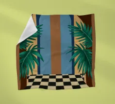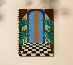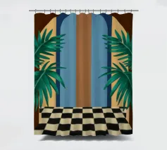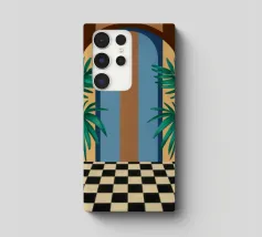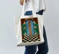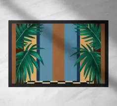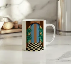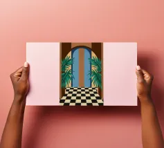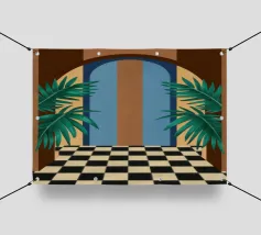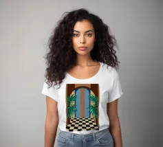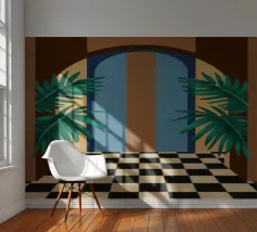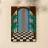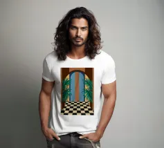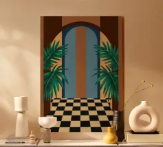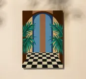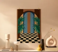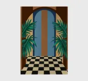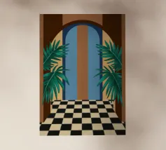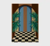 A view through a beautiful archway, with a black and white checkered path leading the eye through a lush, tropical garden. The composition is serene, elegant, and has a timeless, architectural beauty.