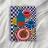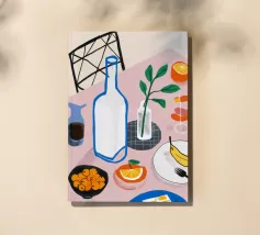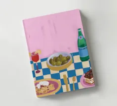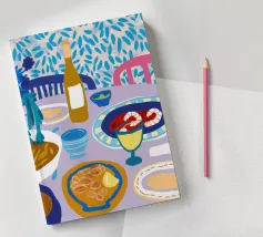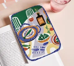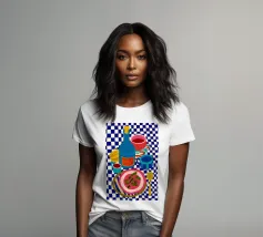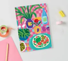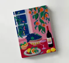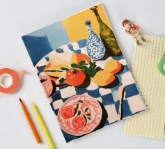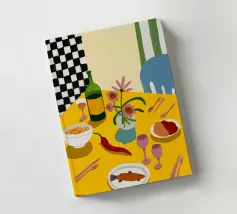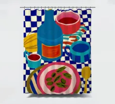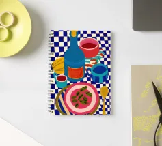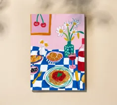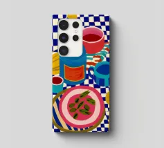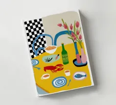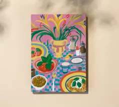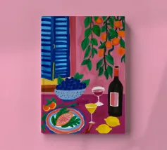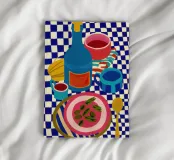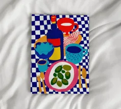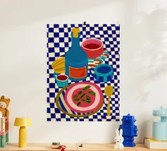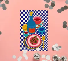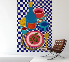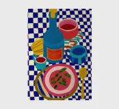 A vibrant still life of a picnic or outdoor meal, featuring wine, fruit, and glasses on a bold checkered cloth. The high contrast colors and graphic style create a festive and appetizing scene.