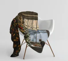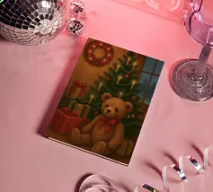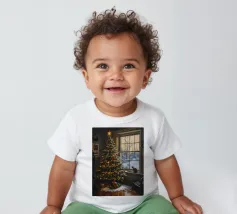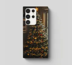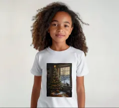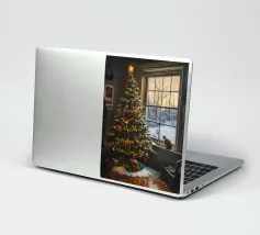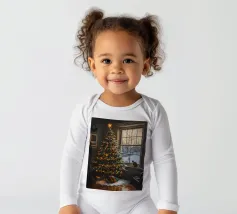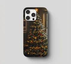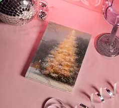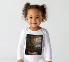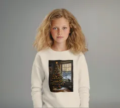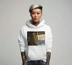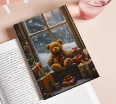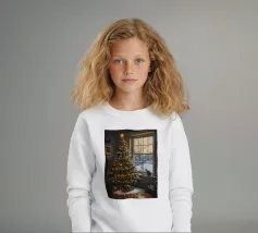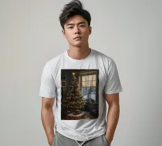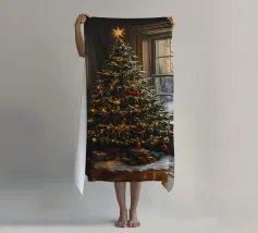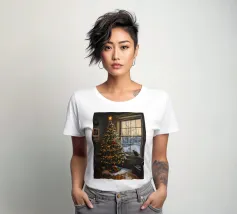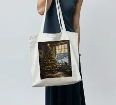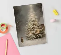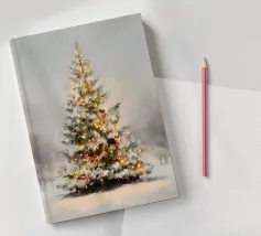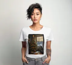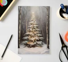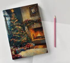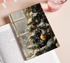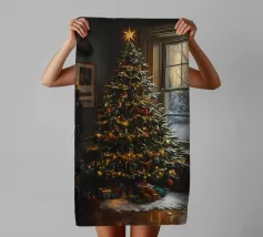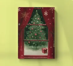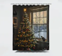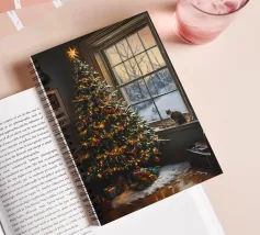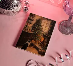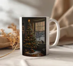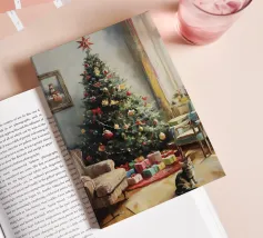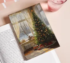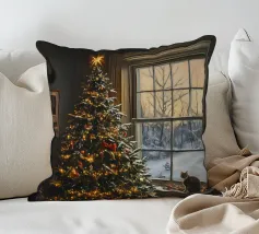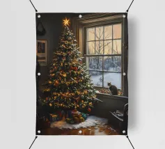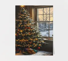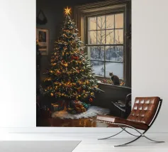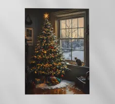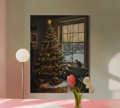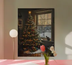 A magnificently decorated Christmas tree lights up the warm living room, while the winter outside rests in quiet beauty. A cat sits on the windowsill and gazes out at the snow-covered landscape. This atmospheric painting combines cosiness, festive glamour and wintry tranquillity - a perfect motif for the contemplative Christmas season.