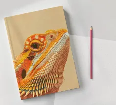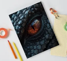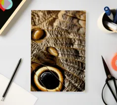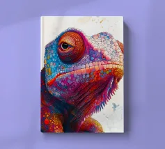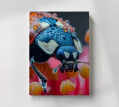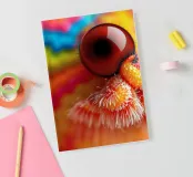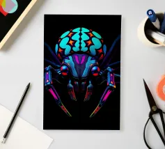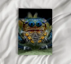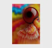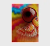A striking close-up reveals a vibrant creature adorned with colorful patterns and intricate details. The design features a prominent eye and delicate textures