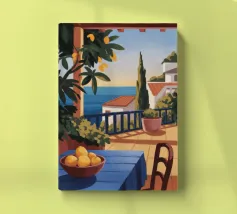 This painting illustrates a stone pathway leading through blooming pink flowers to a tranquil ocean. The picturesque landscape embodies peace and natural beauty.