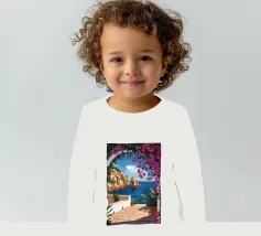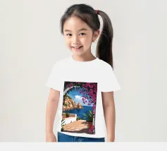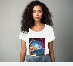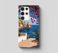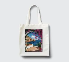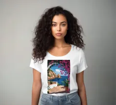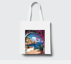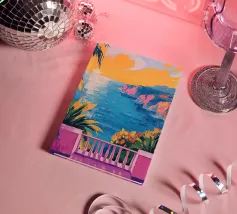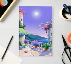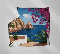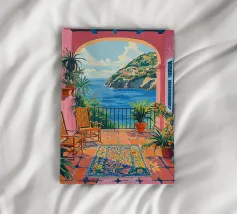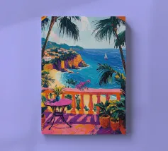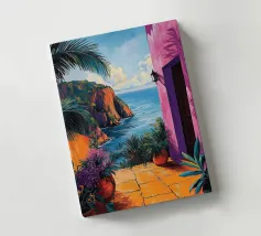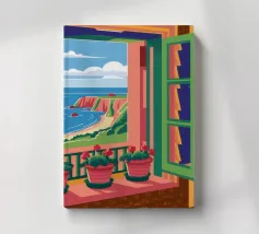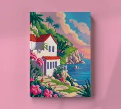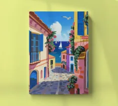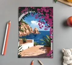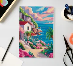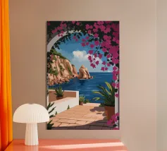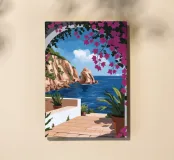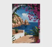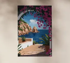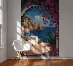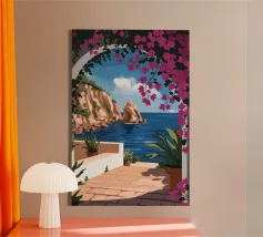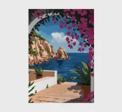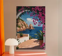 This painting illustrates a stone pathway leading through blooming pink flowers to a tranquil ocean. The picturesque landscape embodies peace and natural beauty.