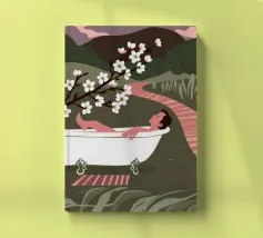 A woman in a lime green dress sits gracefully by the sea, with sailboats on the water and birds in the sky, capturing a moment of serene coastal living.