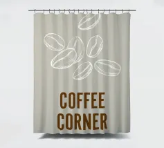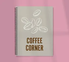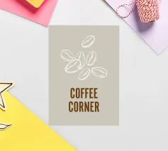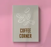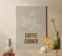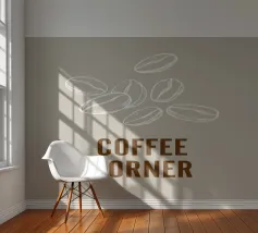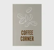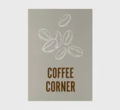 White sketches of coffee beans are scattered light Below the beans, the words "COFFEE CORNER" are prominently displayed brown leitters.