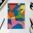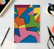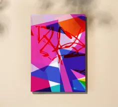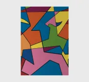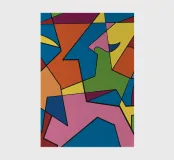 Geometric shapes with various colors neatly segment the space, creating a mosaic of abstract forms. Shades of blue, green, purple, red, and yellow intersect with black outlines to give a stained-glass effect.