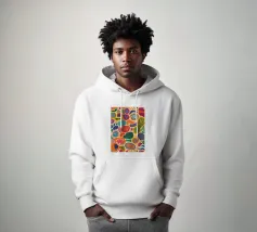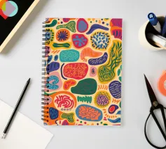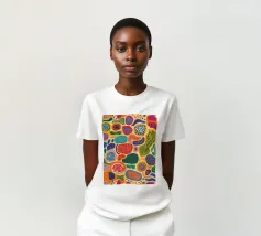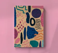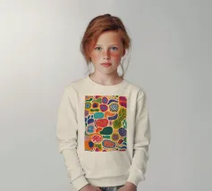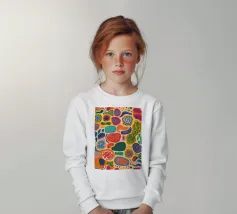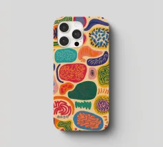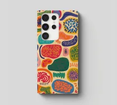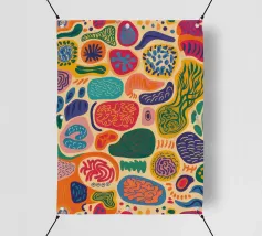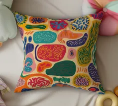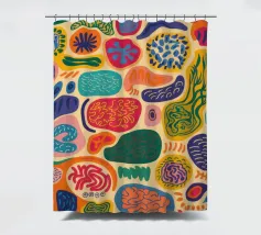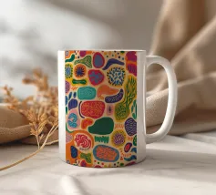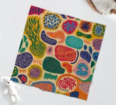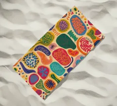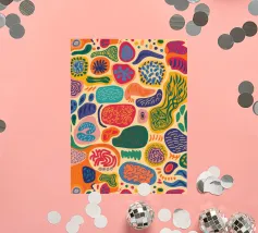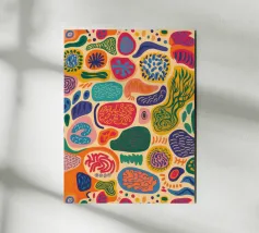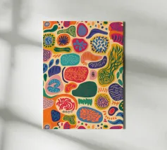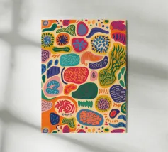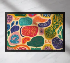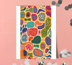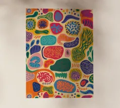 An abstract composition of colorful, pebble like shapes with various patterns and textures. The piece is a playful, vibrant, and imaginative design, reminiscent of a riverbed or a mosaic.