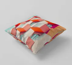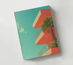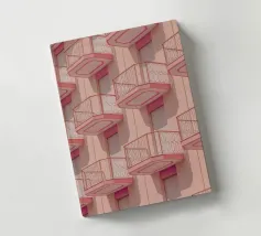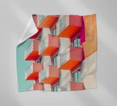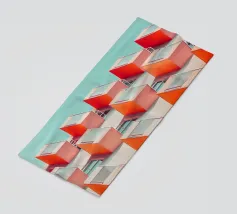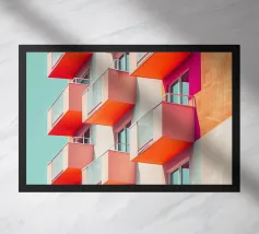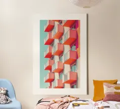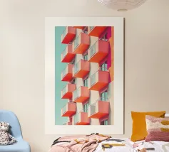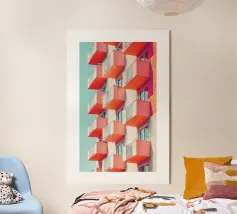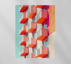 This image shows a modern architectural design with a series of bright, red-orange balconies on the façade of a building. The balconies are arranged in a repeating pattern, creating an eye-catching visual rhythm. Each balcony is accented with sleek metal railings and glass panels, adding to a modern aesthetic. The exterior wall of the building is a soft, light beige colour that contrasts beautifully with the vibrant balconies. The sky in the background is a clear, pastel blue, which emphasises the bright and lu