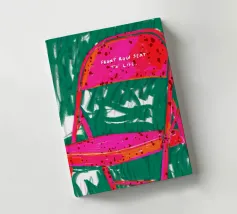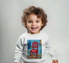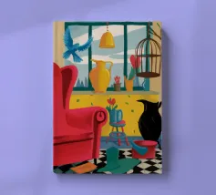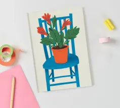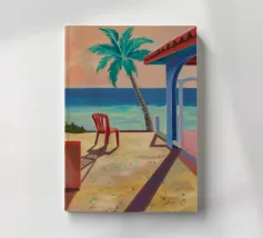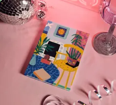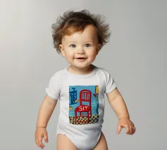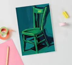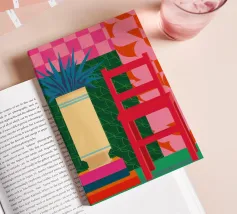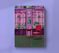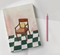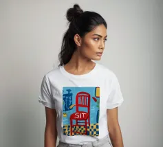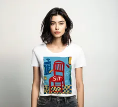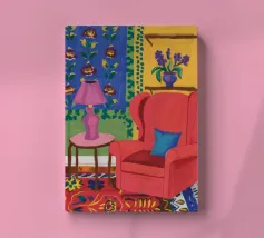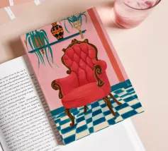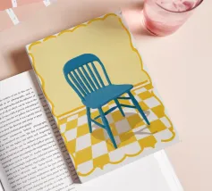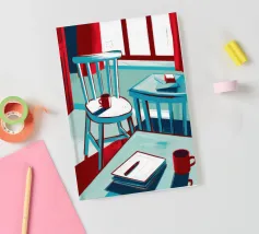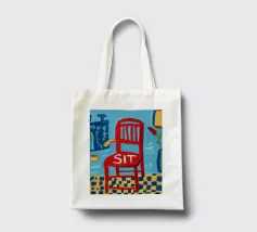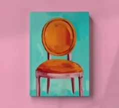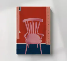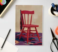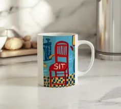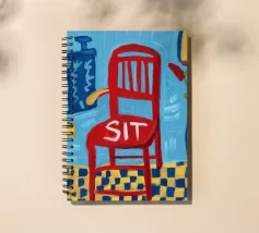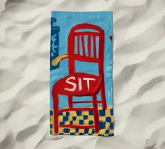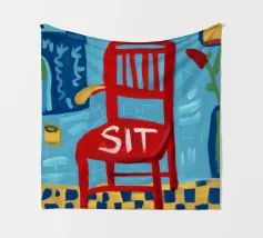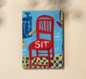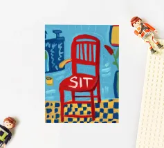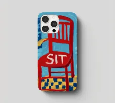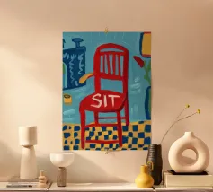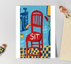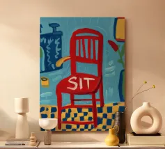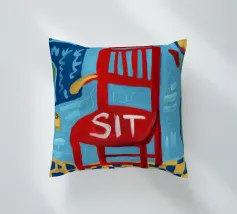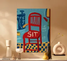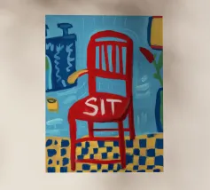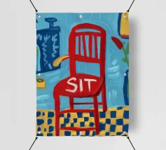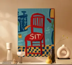 A bold graphic illustration of a vibrant red chair with the word IT' inscribed on it, set against a dynamic blue and yellow patterned background.