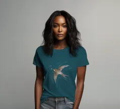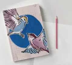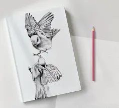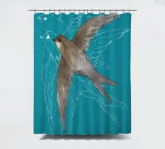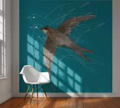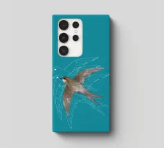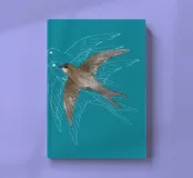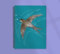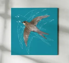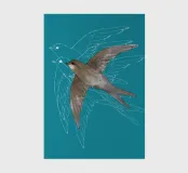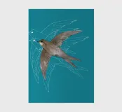 A watercolor drawing of a swift in the sky. After drying, the watercolour has been treated with East Indian ink and a crown pen. The background has been added digitally. There you see the line drawing in white.