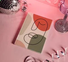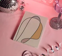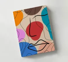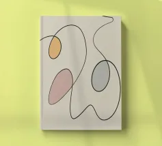 A minimalist design features a continuous black line weaving through colorful geometric shapes, including large circles in various shades. The background is a soft, neutral color that highlights the boldness of the abstract elements.