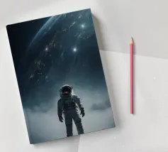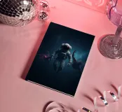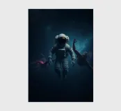An astronaut floats in a dark cosmic environment surrounded by ethereal, abstract figures.