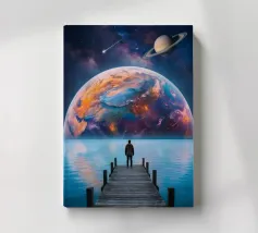 Step into a playful cosmic fantasy with this vibrant surreal artwork featuring a pair of rugged boots floating effortlessly through a colorful galaxy. Surrounded by planets, stars, comets, and nebula clouds, the design blends humor, imagination, and adventure into one bold visual. The warm tones of the boots contrast beautifully with the deep space background, creating a fun, eye-catching piece perfect for dreamers, explorers, and lovers of quirky cosmic art.