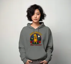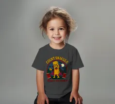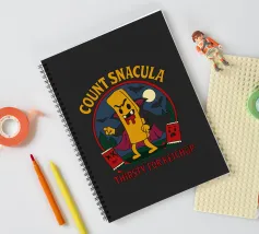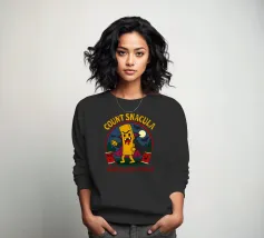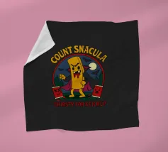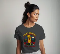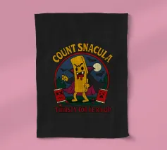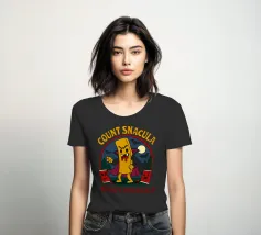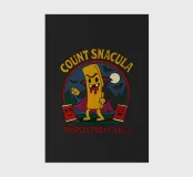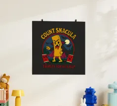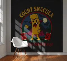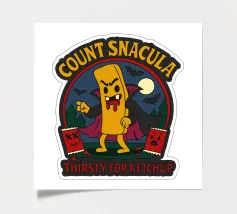 A cartoonish vampire french fry stands menacingly, cape flowing, surrounded by scared ketchup packets and a spooky night forest. This fun horror parody shows Count Snacula, a crispy villain thirsty for ketchup instead of blood. Perfect for fans of quirky food art, Halloween lovers, and anyone with a dark sense of humor.