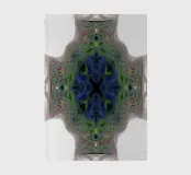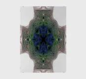 This design shows a motif of a cross in a symmetrical, concentric arrangement in the style of a mandala or a kaleidoscope. The dark centre contrasts strikingly with the white background. The abstract forms of the motif are designed with lines, curves and wavy, multi-coloured lines. The entire motif conveys a psychedelic aura with an optical illusion. The cross with its vibrant colours is the central focus in the light, creating a special aura.