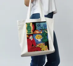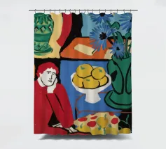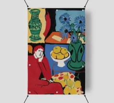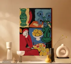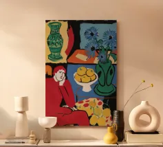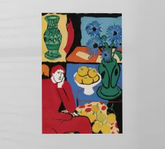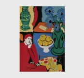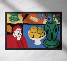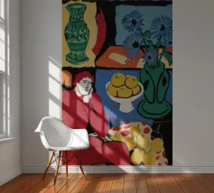 A vibrant and complex still life in a cubist style, featuring a table laden with a vase of flowers, a bowl of fruit, and other objects. The artwork is a rich and dynamic exploration of form and color, reminiscent of early modern masters.
