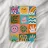 A colorful patchwork quilt design featuring cute characters like a sun, a rainbow, a lion, a bunny, and abstract hands on checkered backgrounds.