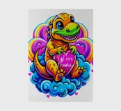This sweet little dinosaur is all about spreading love, as it joyfully clutches a bright pink heart while floating on a bed of colorful clouds. With its big, shining eyes and playful expression, this dino brings an irresistible charm to any setting. The vibrant hues of orange, green, and pink make it a delightful visual treat for dino-lovers of all ages. Whether it’s a cute addition to your decor or a fun gift, this lovable dinosaur is ready to share smiles and warmth!