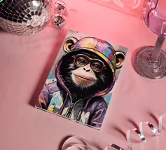 Monkey on Penny-Farthing Bicycle in Victorian Street A charming monkey in a three-piece suit navigates a bustling Victorian-era street on a vintage penny-farthing bicycle, with vivid colors and sharp detail reminiscent of hyperrealistic art.