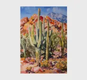 A tall, solitary saguaro cactus stands as a sentinel in the vast desert, its iconic form set against a backdrop of distant red mountains and a warm, hazy sky, symbolizing the spirit of the Southwest.