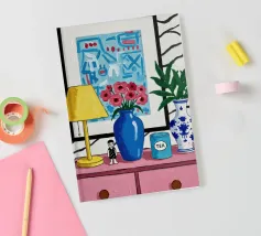 A quirky desk with pink lamp, vase flowers, matryoshka, and tea brings playful personality.