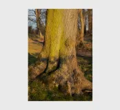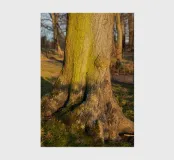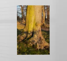 On a quiet winter evening, the trunk of a tree glows in golden-brown and green colours at sunset. Warm sunlight illuminates the sleeping nature in the cold season. This detail shot is dedicated to the timeless elegance of old trees and the annual change in nature.