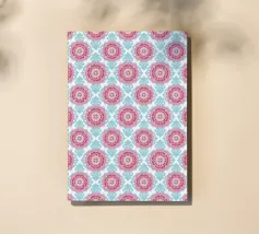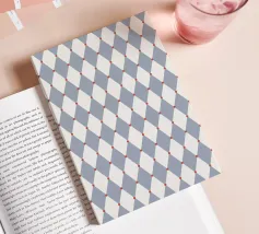 A repeating pattern features diamond shapes in soft pink and white against a light blue background, creating a geometric design. The arrangement of the shapes provides a sense of rhythm and harmony.