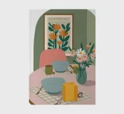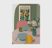 A beautiful still life of a bouquet of poppies on a dining table, with a framed artwork in the style of Maraouri on the wall. The scene is an elegant and artistic blend of floral beauty and modern art history.