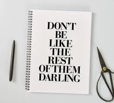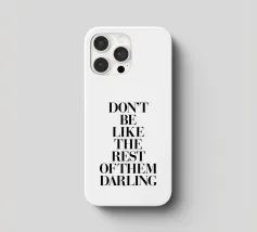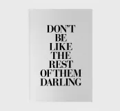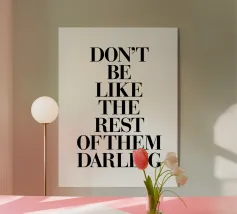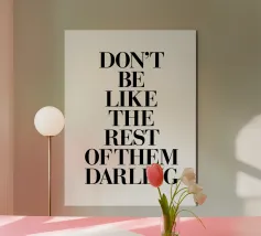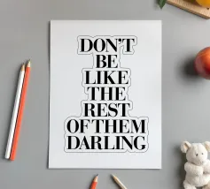 Elevate your space with this chic typography art print featuring Coco Chanel's iconic words. The timeless phrase "Don't Be Like the Rest of Them Darling" is elegantly rendered in stylish serif black lettering on a clean white background. This eye-catching piece combines classic sophistication with a bold message of individuality. Perfect for adding a touch of Parisian flair to any room, from a dressing area to a home office, this artwork is sure to inspire confidence and uniqueness. Let this striking print remind you daily to embrace your distinctive style and stand out from the crowd.