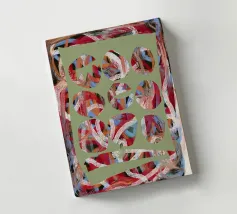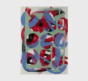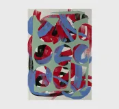 Bold red and blue brushstrokes create an abstract design against a light background, interspersed with patches of black. A pale green shape, reminiscent of a lattice, overlays part of the composition, contributing to the abstraction and depth.